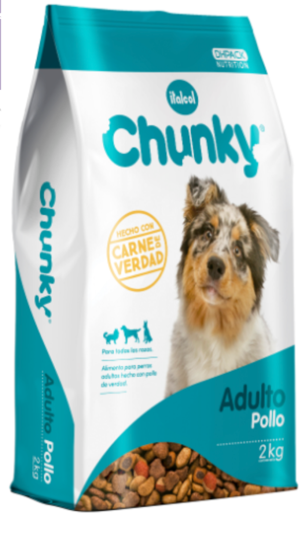 Chunky - Pollo Adultos, esta compuesto por arroz, pollo, harina de pollo, maíz, salvado de trigo, yuca, aceite de pollo, hidrolizado de hígado de pollo, semilla de lino, cloruro de sodio, carbonato de calcio, fosfato dicálcico, cloruro de potasio, manano -oligosacáridos de la (no-GM) saccharomyces cerevisiae, cloruro de colina, hierro quelado, sulfato ferroso, hidroxicloruro de zinc, zinc quelado, beta-glucanos, selenio quelado, cobre básico cloruro, cobre quelado, yodato de calcio, hidroxicloruro de manganeso, manganeso quelado, selenito de sodio, vitamina E tocoferol acetato, vitamina B3 niacinamida, vitamina B5, vitamina A retinol, vitamina H biotina, vitamina B2 riboflavina, vitamina K3 menadiona, vitamina B12 cianocobalamina, vitamina B1 tiamina, vitamina B6 piridoxina, vitamina D3 colecalciferol, vitamina B9 ácido fólico, sales de ácido propiónico, tocoferoles, aceite de romero, ácido cítrico. Análisis Garantizado: Proteína Mínimo 22,0% - Grasa Mínimo 10,0% - Fibra Máximo 4,0% - Humedad Máximo 10,0% - Calcio Mínimo 1,0% - Fósforo Mínimo 0.8% - Cenizas Máximo 8.0%.